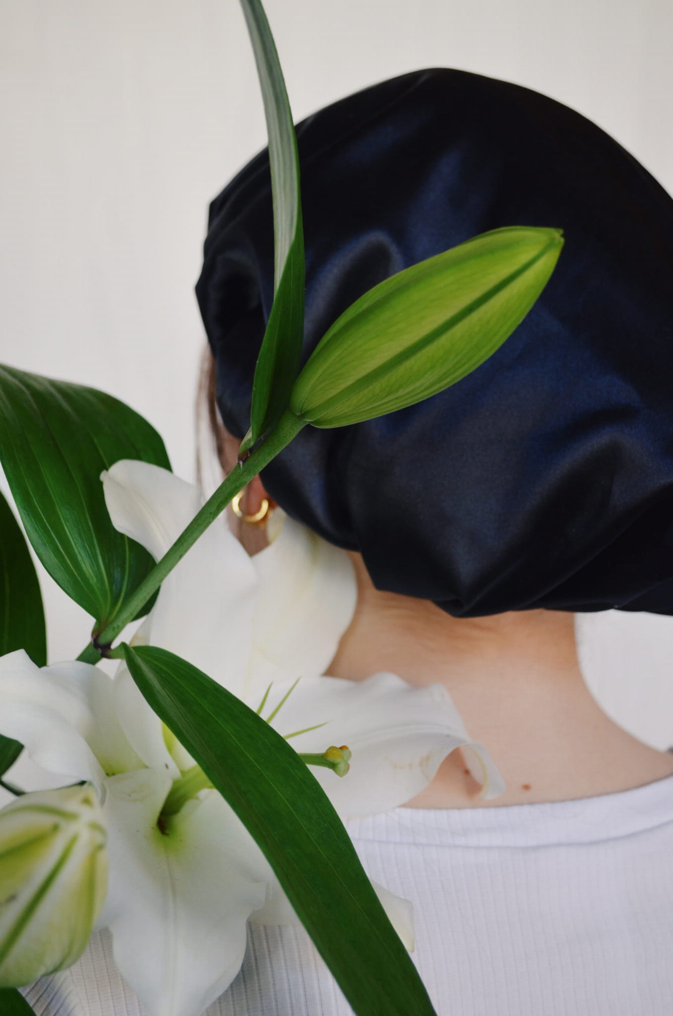 Jedwabny czepek chroniący włosy przed plątaniem, łamaniem i przed puszeniem powodowanym tarciem o poduszkę w nocy.