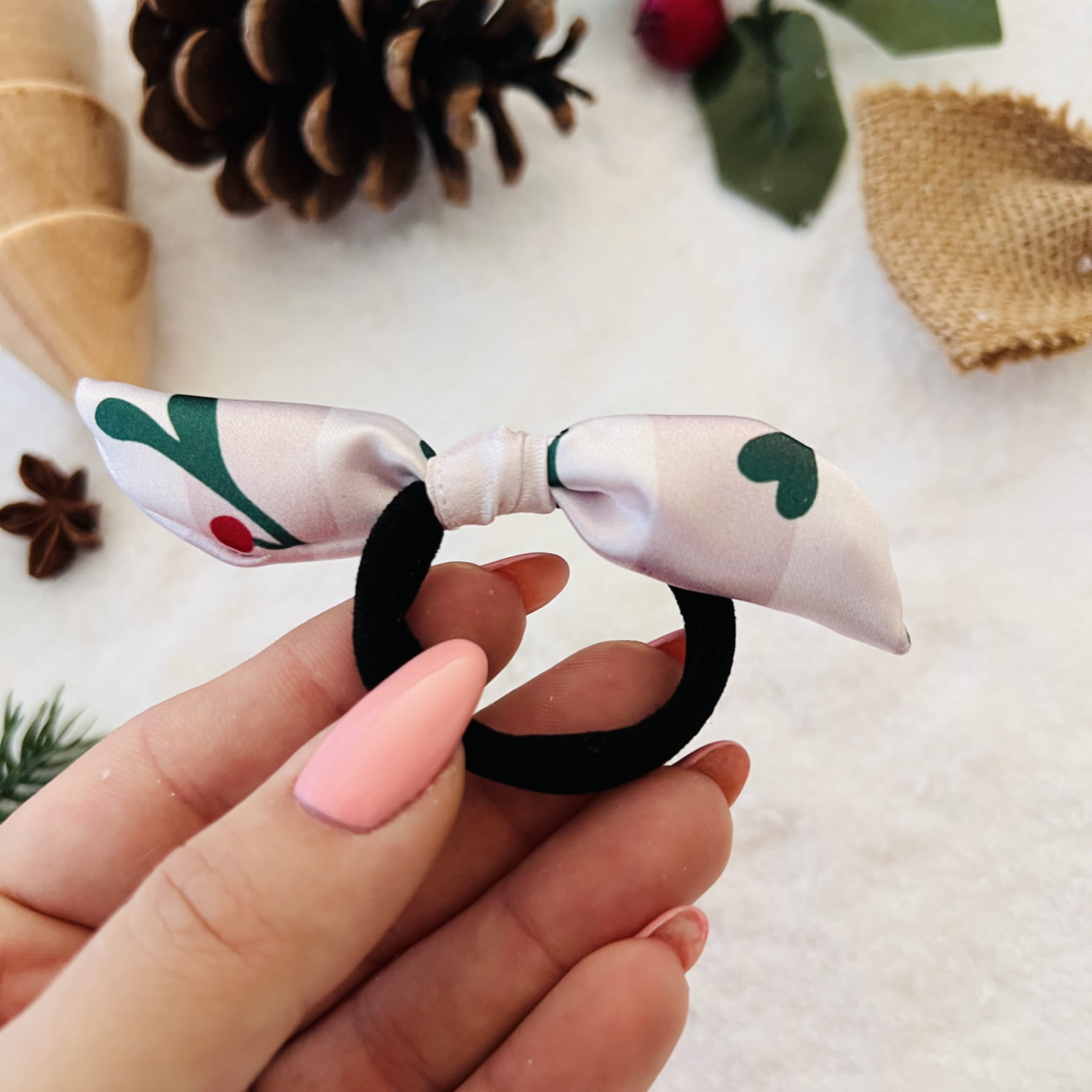 Mocno elastyczna tradycyjna gumka do włosów w rozmiarze M z ozdobną kokardką. Autorski wzór.