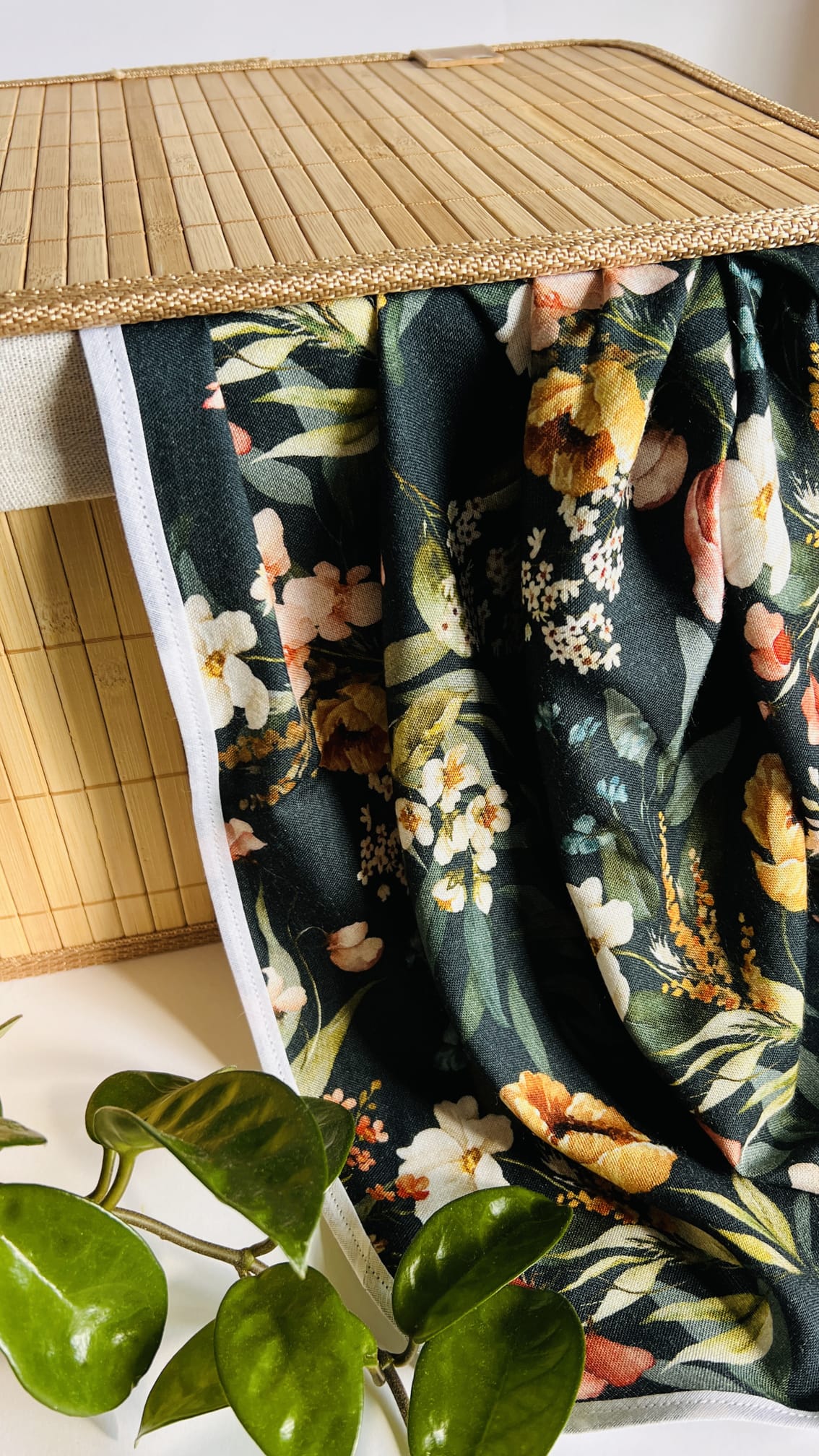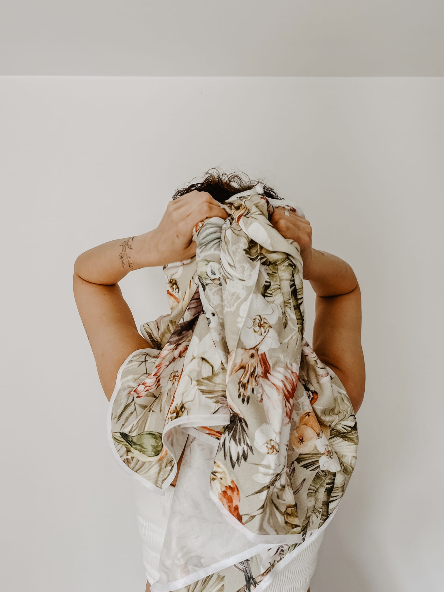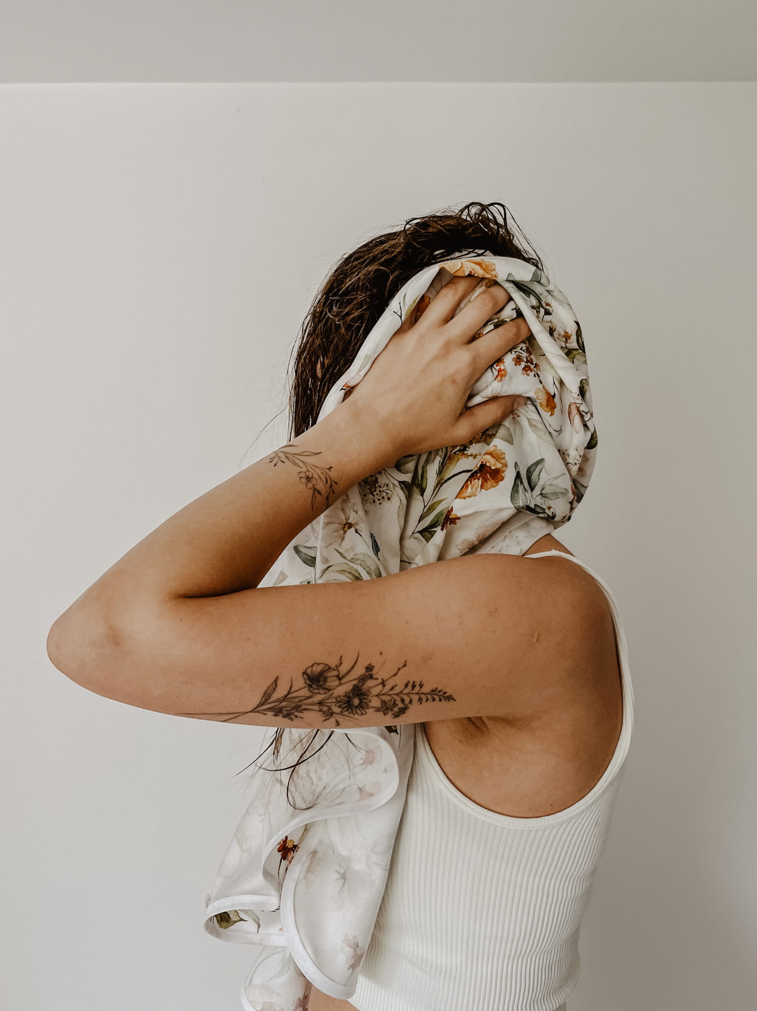 Ręcznik do włosów we wzorze Botanic to niezbędnik każdej prawdziwej włosomaniaczki! Został wykonany w całości z wiskozy bambusowej polskiej produkcji i obszyty bawełnianą lamówką w kolorze białym. Dzięki pętelce na jednym z dłuższych z boków ręcznika można zawiesić go wygodnie na wieszaku.
