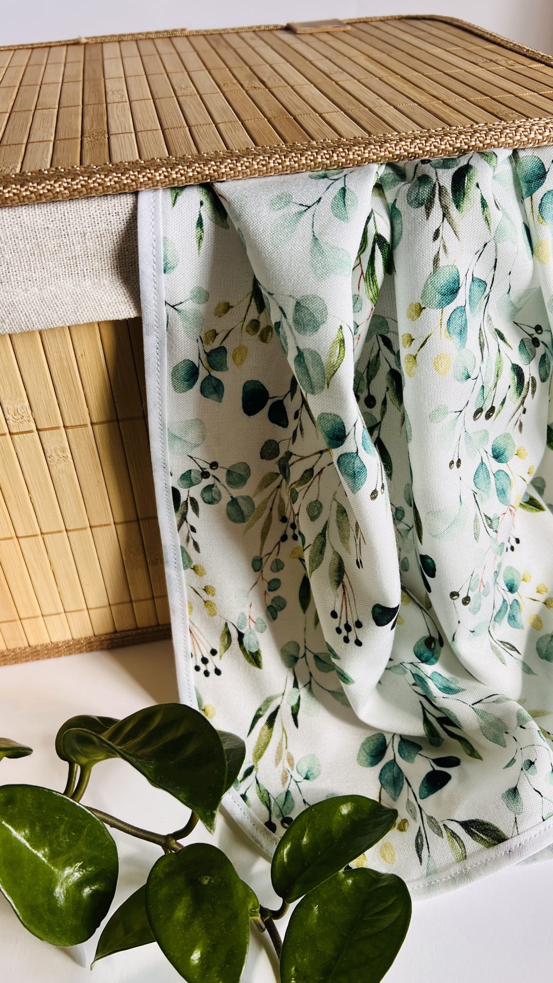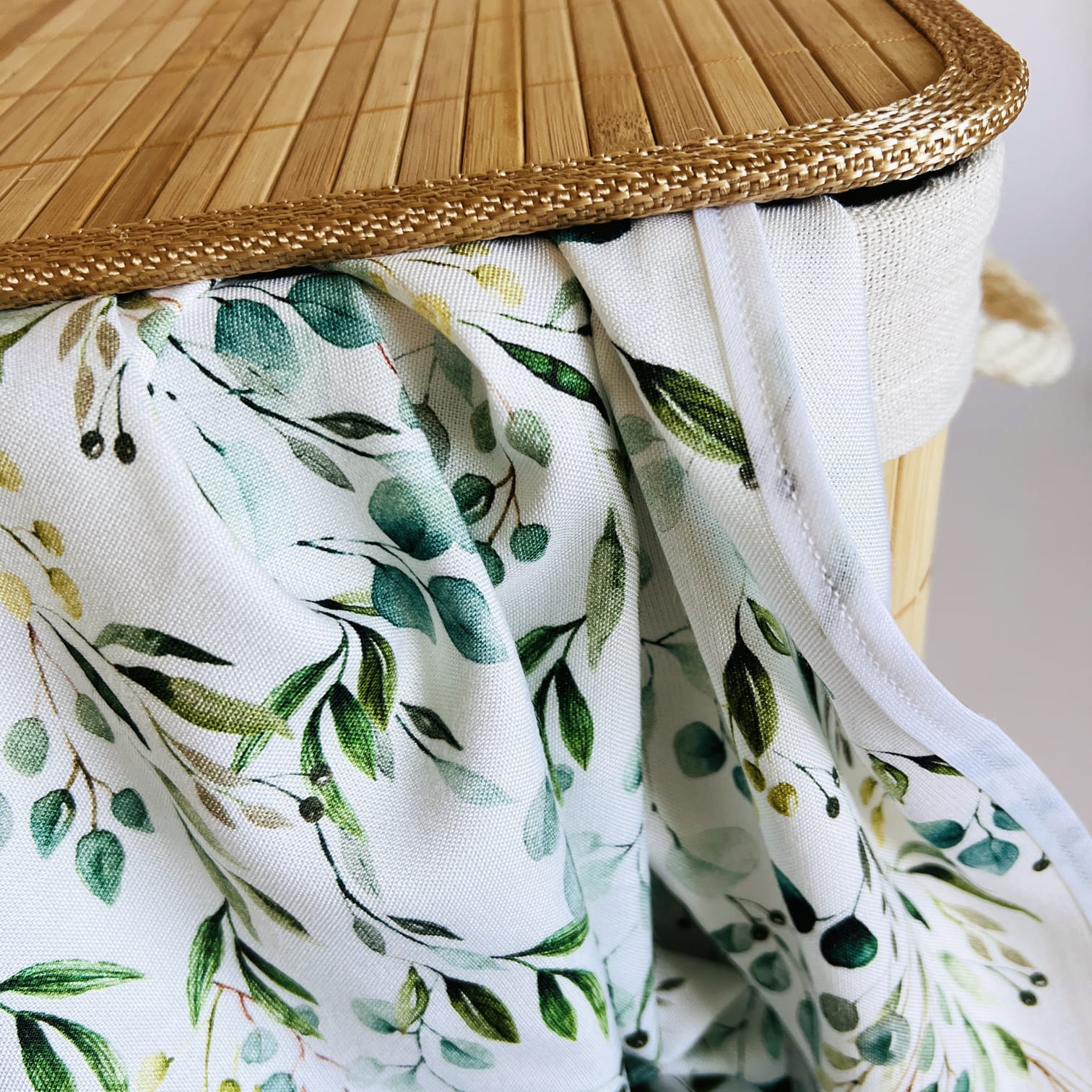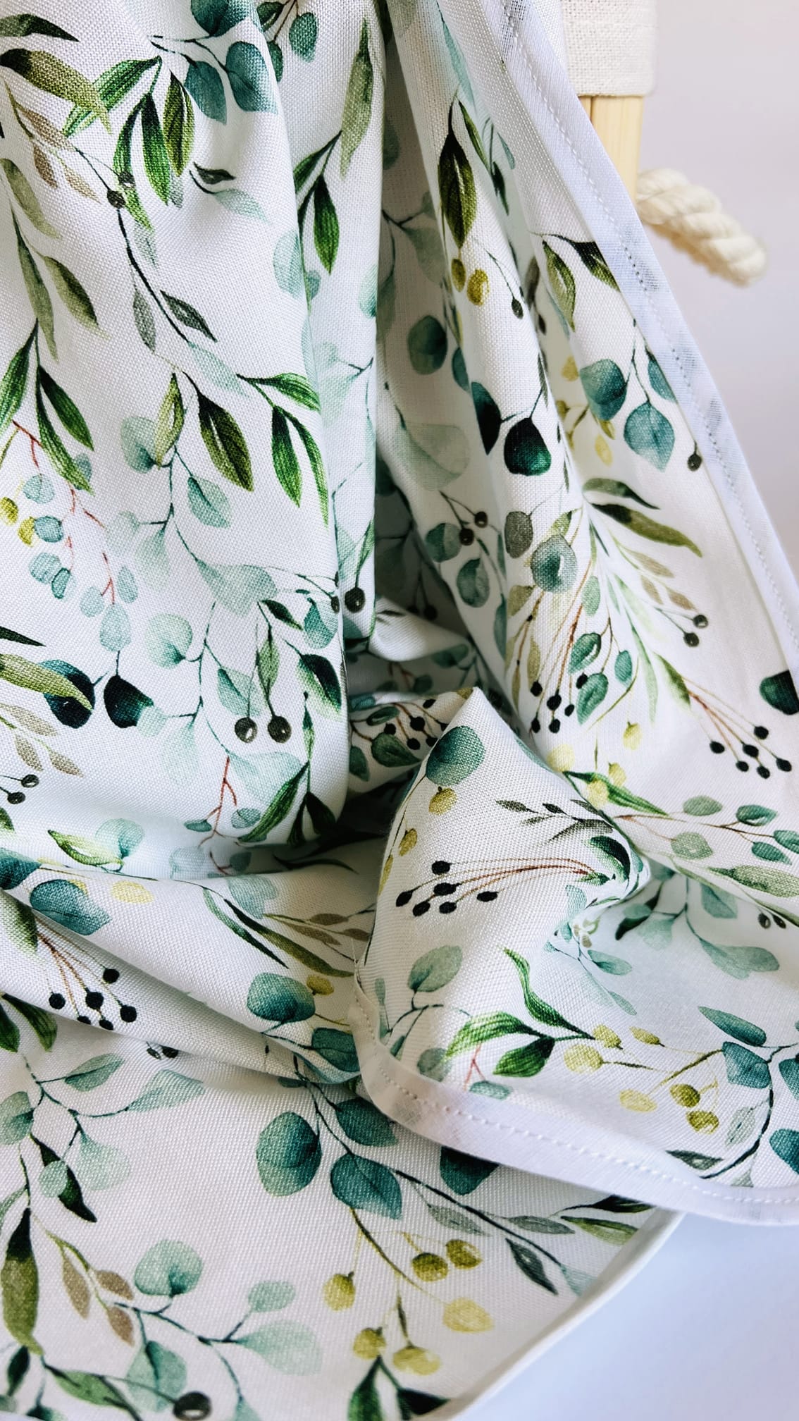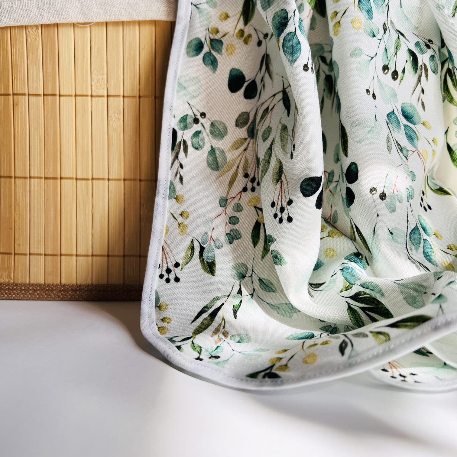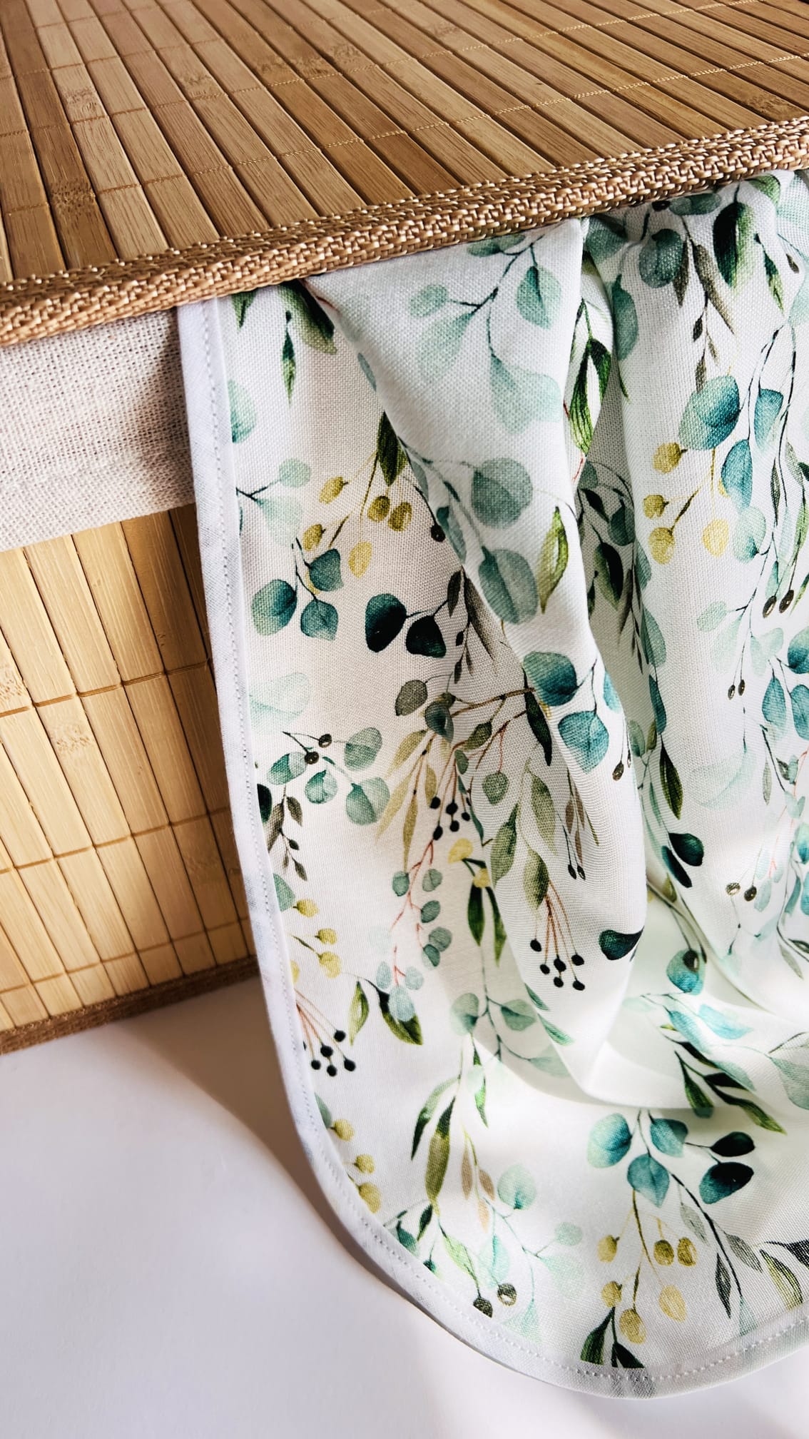 Ręcznik do włosów we wzorze Eucalyptus to niezbędnik każdej prawdziwej włosomaniaczki! Został wykonany w całości z wiskozy bambusowej polskiej produkcji i obszyty bawełnianą lamówką w kolorze białym. Dzięki pętelce na jednym z dłuższych z boków ręcznika można zawiesić go wygodnie na wieszaku.