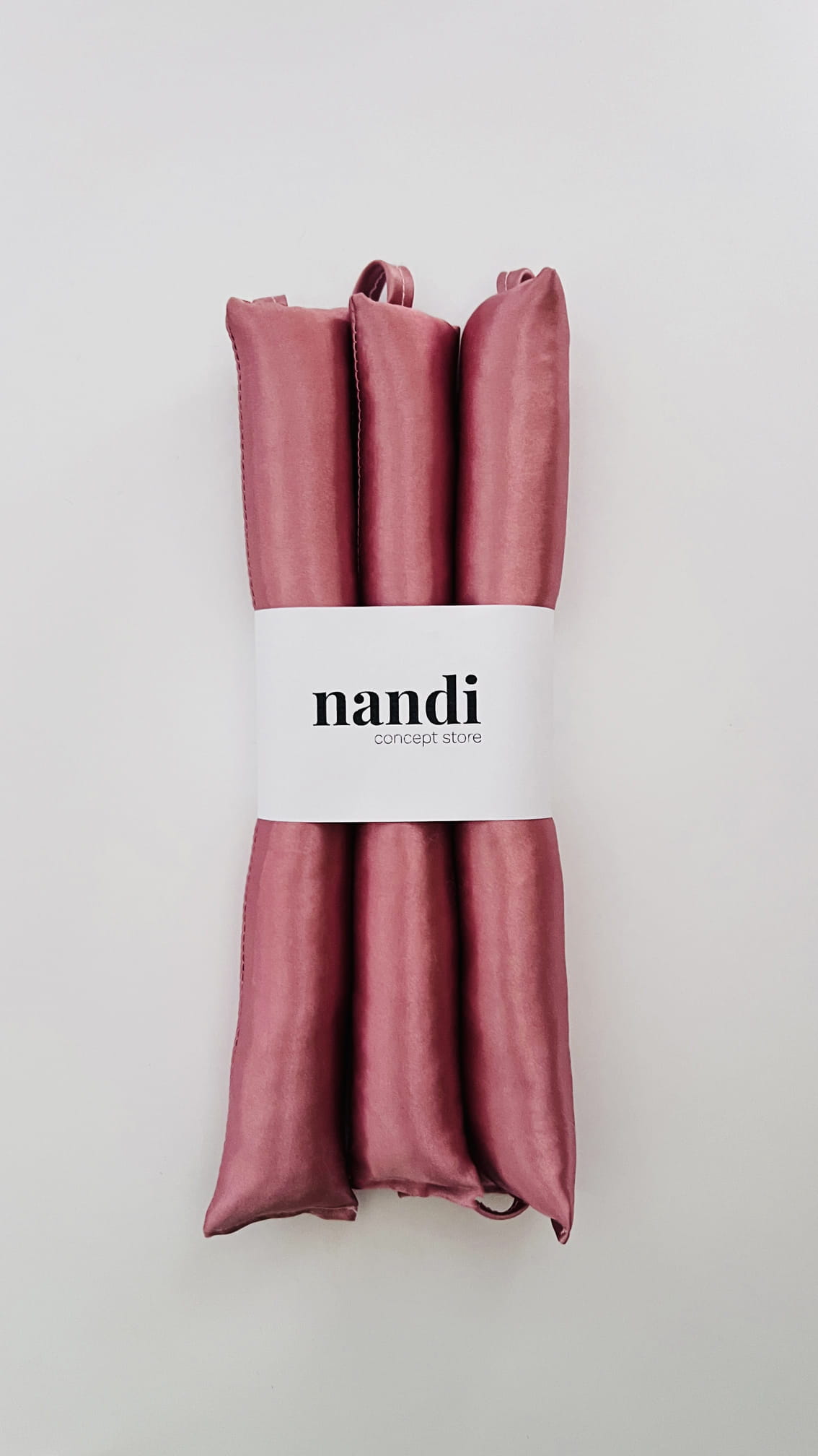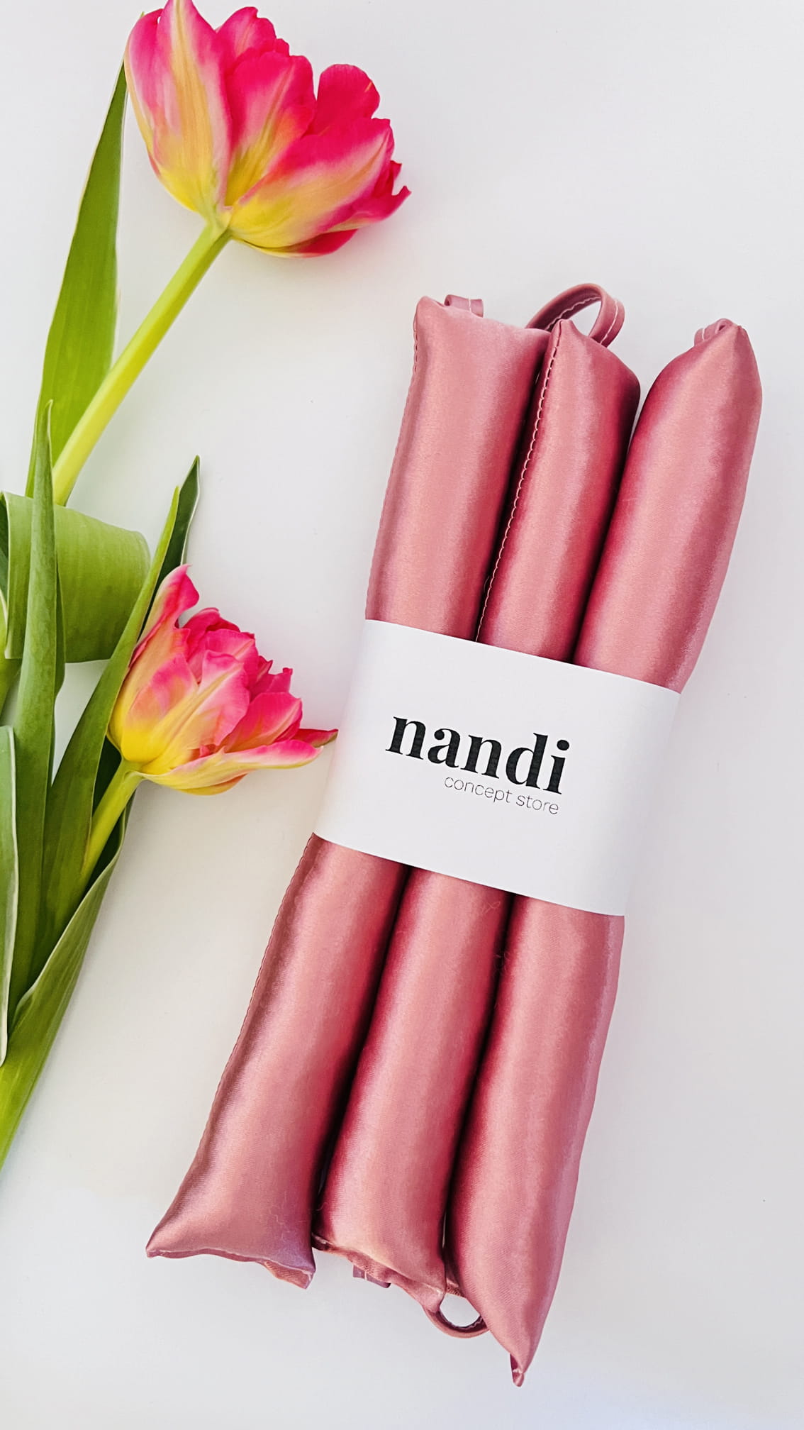 Papiloty są wykonane w całości z satyny syntetycznej o śliskiej powierzchni. Wypełnienie stanowi antyalergiczna kulka silikonowa.