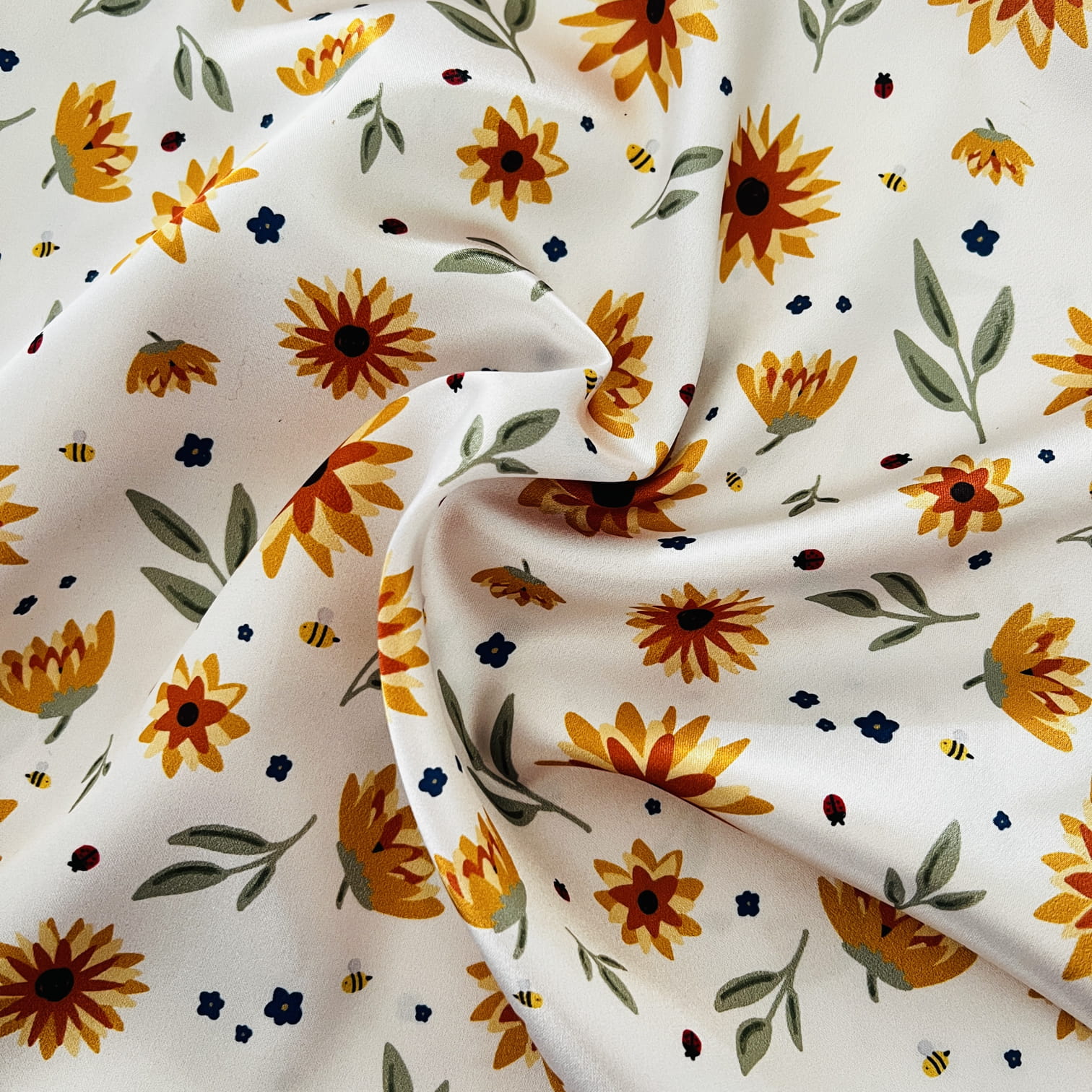 Radosny wzór z dużymi, złocistymi kwiatami na jasnym tle, przywodzący na myśl letnią łąkę skąpaną w słońcu. Ma w sobie energię, ciepło i lekkość – jak wakacyjny dzień spędzony na świeżym powietrzu. Ten wzór dostaniesz tylko w Nandi!