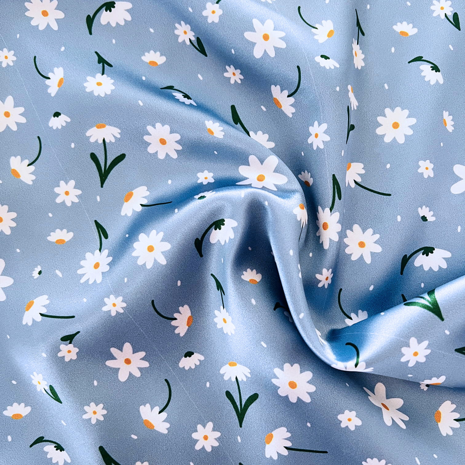 Delikatne białe stokrotki rozsiane na błękitnym tle tworzą lekki, świeży i romantyczny wzór. Kojarzy się z wiosennym niebem, spokojem i subtelną kobiecością, dodając stylizacji naturalnego uroku. Ten wzór dostaniesz tylko w Nandi!