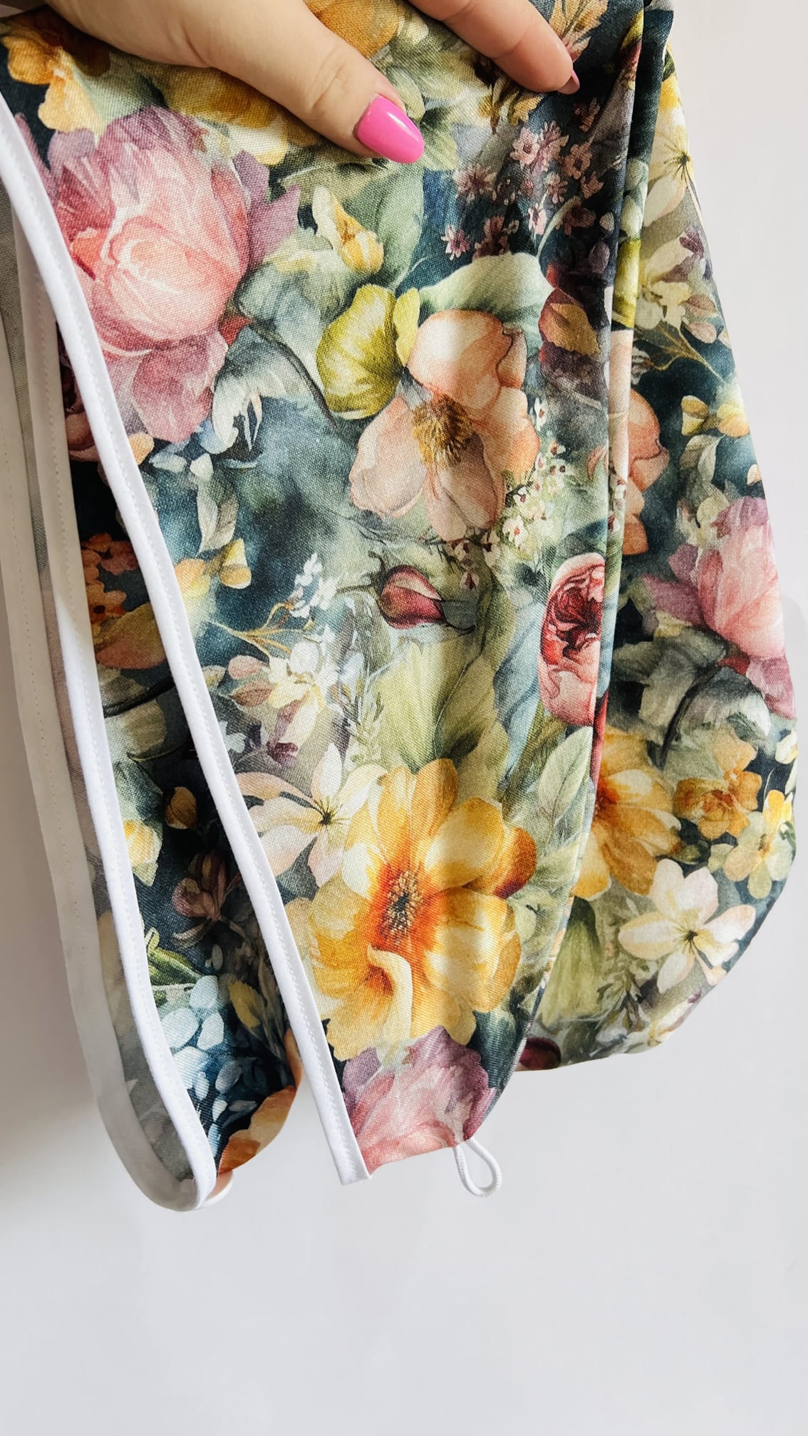 Turban do włosów we wzorze Flowers to niezbędnik każdej prawdziwej włosomaniaczki! Został wykonany z wysokiej jakości wiskozy bambusowej polskiej produkcji i obszyty bawełnianą lamówką w kolorze białym. Dzięki gumowej pętelce na jednym z końców i guzikowi na drugim masz możliwość regulacji obwodu turbanu, co sprawi, że będzie idealnie dopasowany. Dzięki niemu szybko wysuszysz włosy, a także zadbasz o ich kondycję.